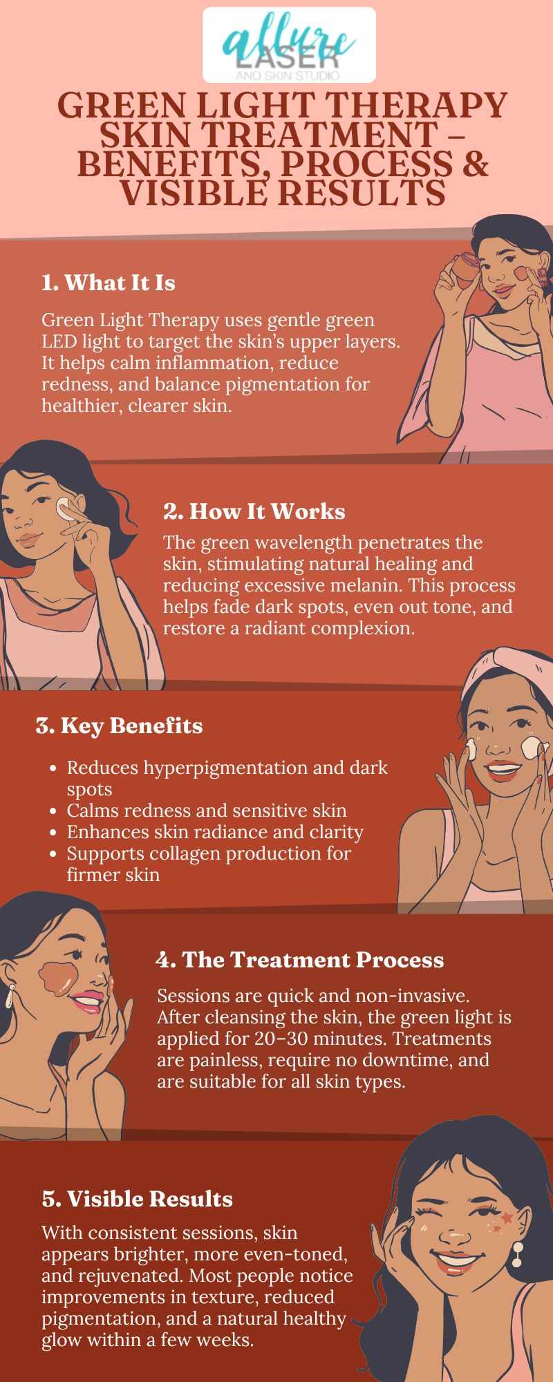 Revitalise your complexion with Green Light Therapy in Mackay at Allure Laser and Skin Studio. This gentle yet powerful treatment targets redness, pigmentation, and uneven skin tone while promoting a brighter, more balanced complexion. Designed to calm the skin and boost natural radiance, our therapy helps smooth fine lines and restore youthful vitality without downtime. Experience safe, effective skin rejuvenation performed by our expert team and reveal a clearer, healthier glow. Book your Green Light Therapy session today and let your skin shine with confidence!